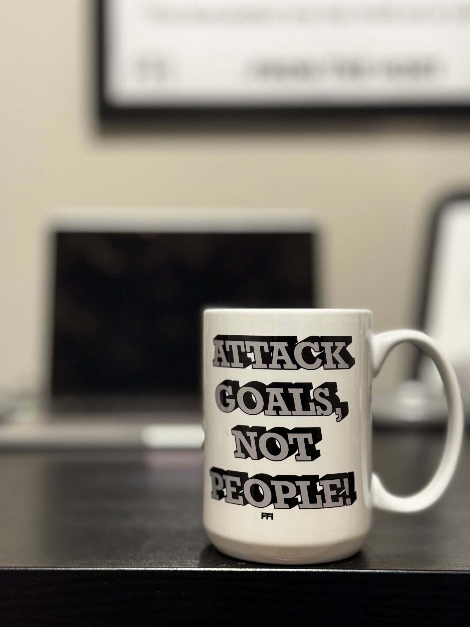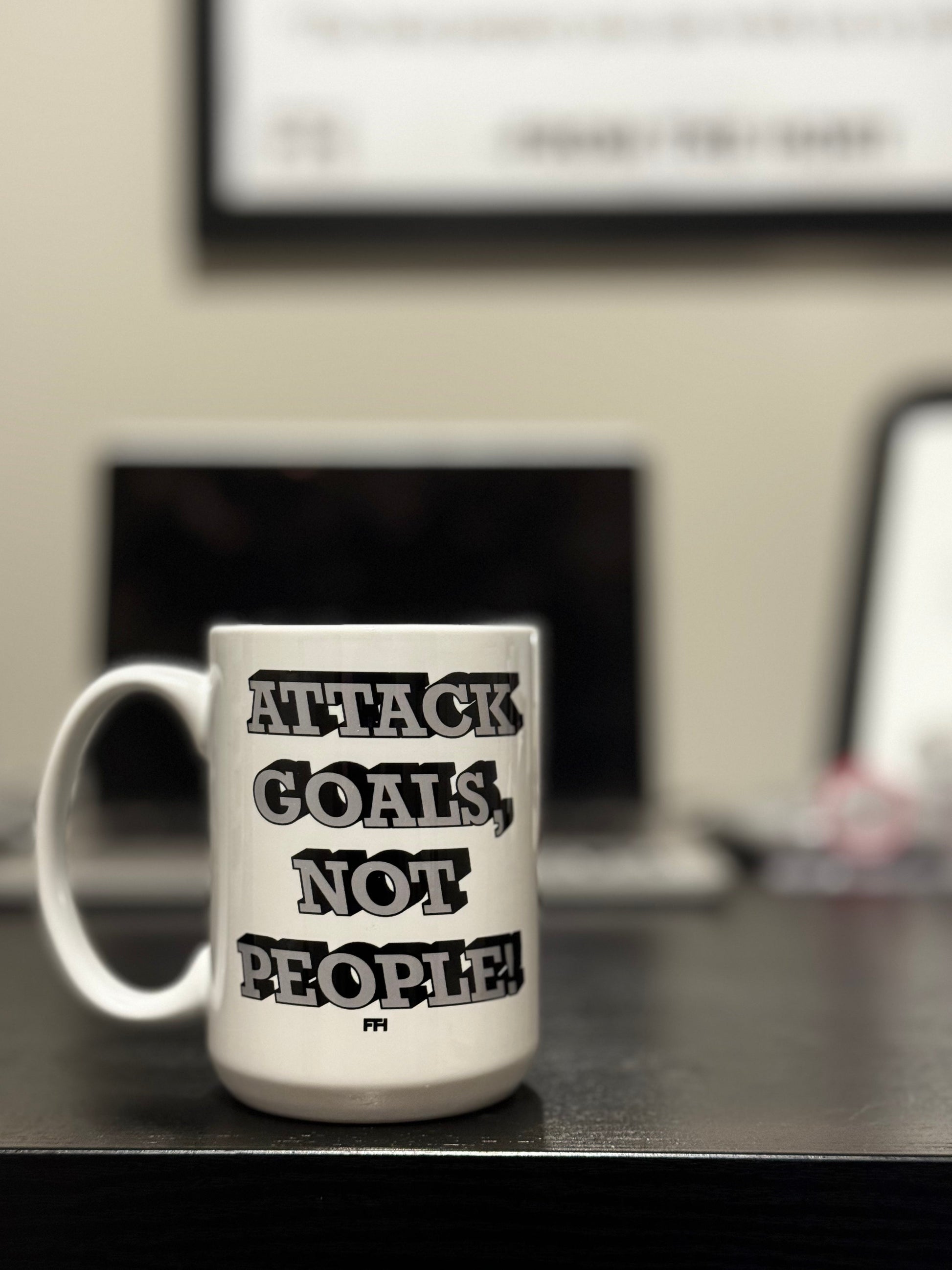 "Attack Goals, Not People" was designed to inspire you to continue chasing your goals vice getting distracted by the issues that arise when interacting with people. Gray was chosen as a neutral option to take with you throughout your day.